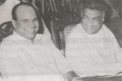 Prime Minister Ranil Wickremesinghe shares a light moment with Milinda Moragoda who recently quit his ministerial partfolio, at a function held at the Sri Dharmadaya Pirivena, Wellawatte on Wednesday