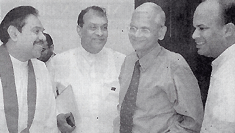 Photo: The three UNPers Karu Jayasuriya, G.L. Peries and Milinda Moragoda engaged in an animated conversation with President Mahinda Rajapakse at the All Party Conference held at the Presidential Secretariat last Friday.